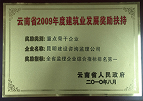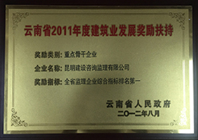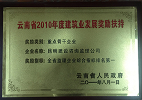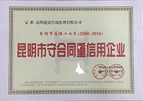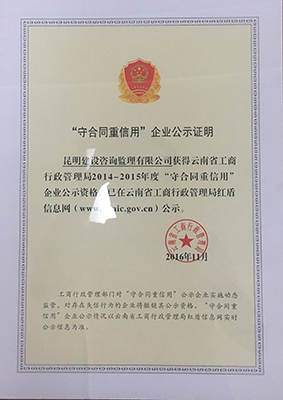 公司從2009年至今連續榮獲“云南省年度建筑業發展獎勵扶持”全省監理企業排名第一企業;連續多年榮獲“納稅突出貢獻企業”稱號;連續十七個年度被評為昆明市“守合同重信用”監理企業,連續八個年度被評為云南省“守合同重信用”監理企業。