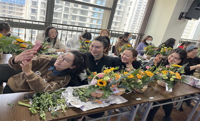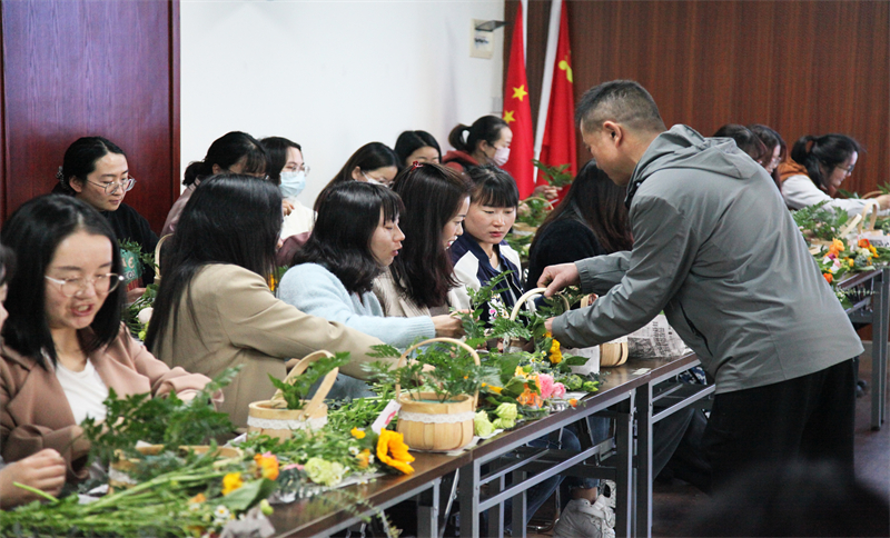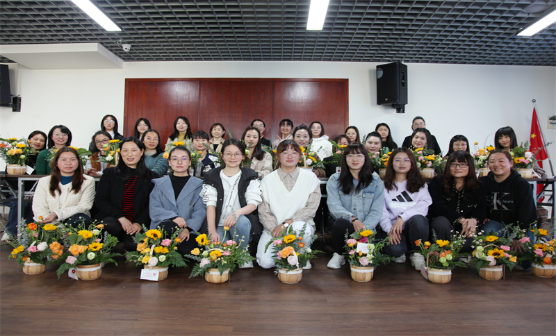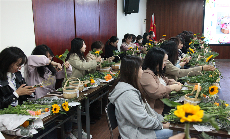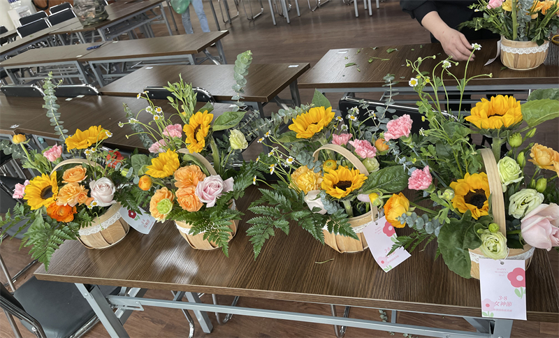 潔白無瑕的白桔梗,清新淡雅的康乃馨,濃烈徇爛的紅玫瑰,金色活潑的向日葵......一束束色彩斑斕的鮮花整齊有序地擺放在桌面上,拉開了插花活動的帷幕。