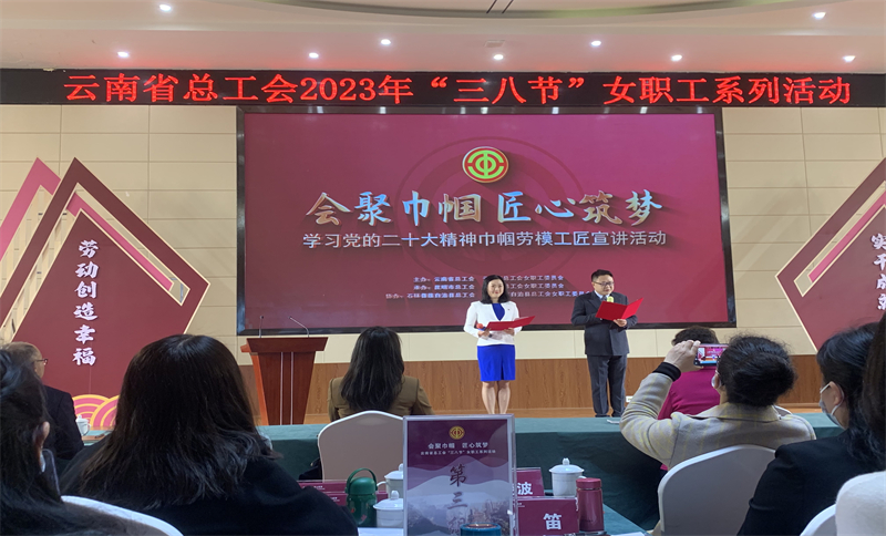 2023年3月2日上午9:00--11:00,為認真學習宣傳貫徹落實黨的二十大精神,在“三八”國際婦女節到來之際,由云南省總工會主辦、昆明市總工會承辦、石林縣總工會協辦了“會聚巾幗·匠心筑夢”一一學習黨的二十大精神巾幗勞模工匠宣講會。